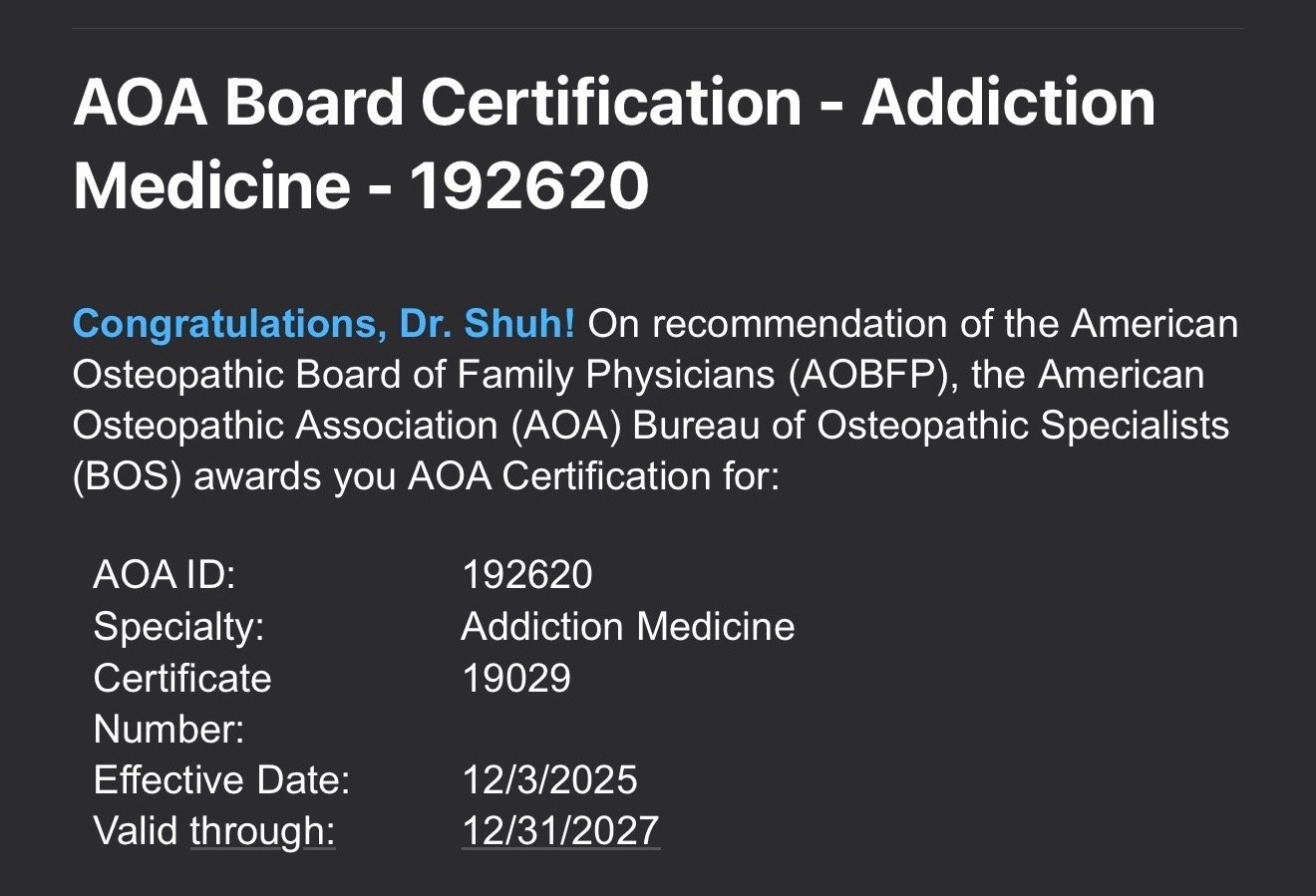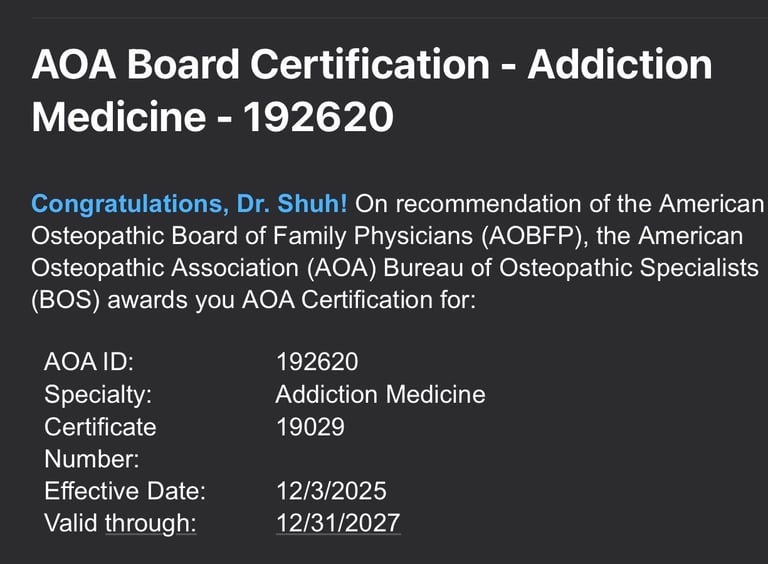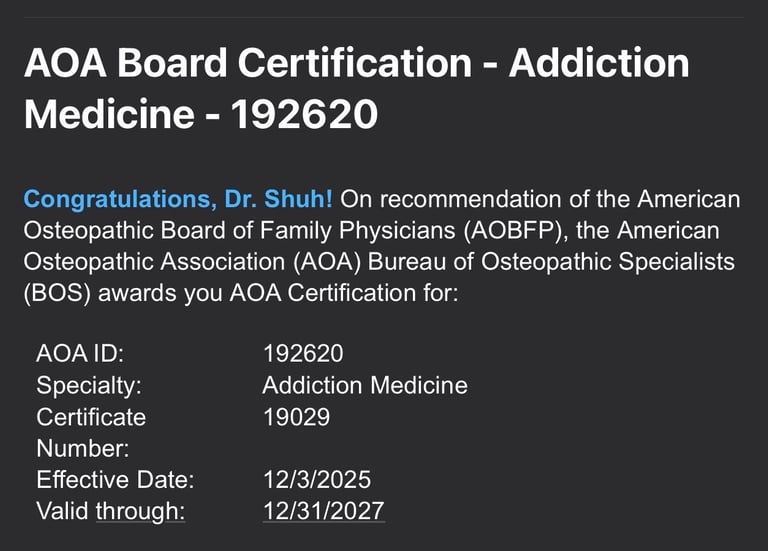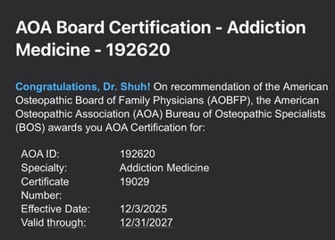 A message from Dr. Shuh - As of 12/03/2025, I became a board certified Addiction Medicine Physician. I will now be accepting Addiction Medicine patients on a limited basis. How this works - if you choose to see me as your Addiction Medicine Physician, I will also be your Family Physician. You will receive all the same services that my Family Medicine patients receive. That said, the fee increases. This is not only for the extra time that Addiction Medicine patients require, but also for specialty consultation. Prices are listed below. Please reach out and contact me if interested (text preferred).